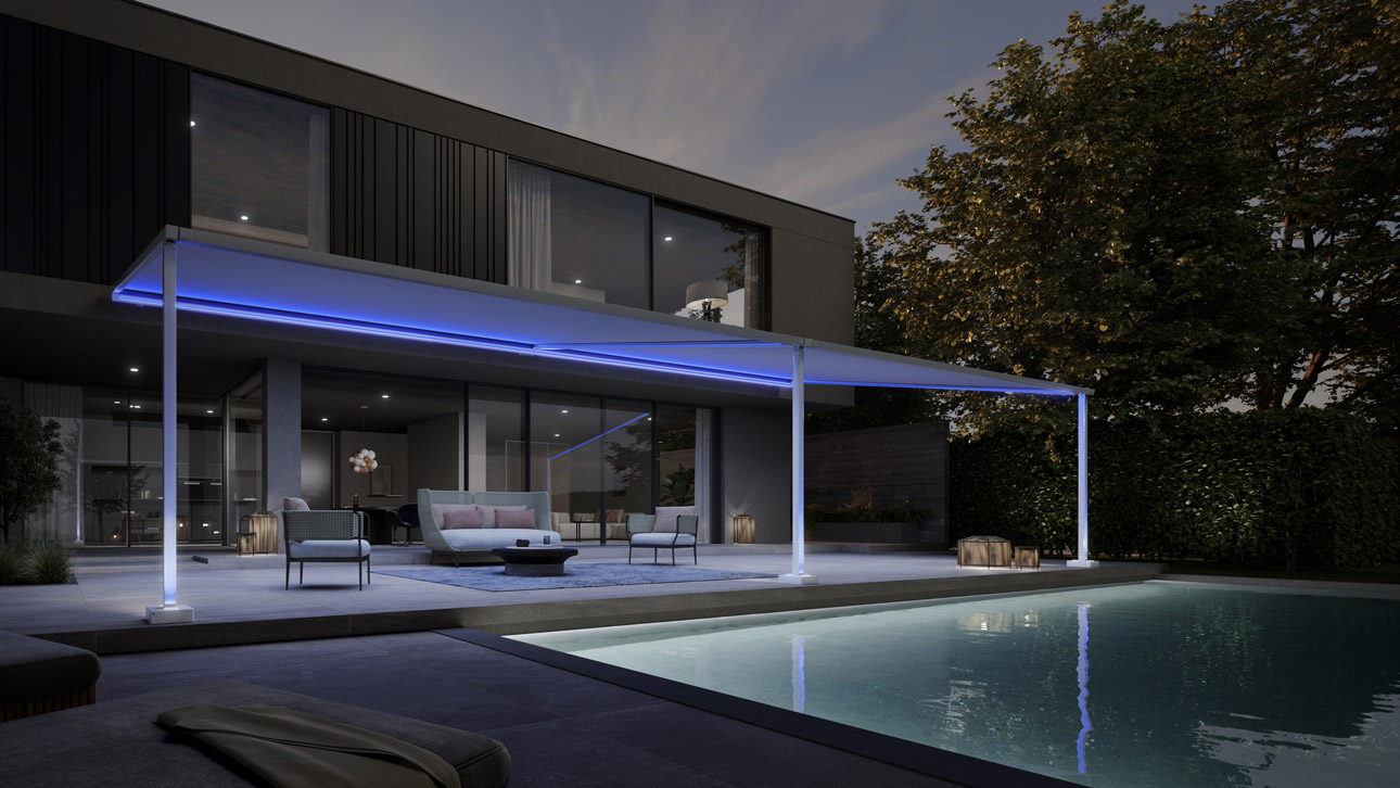 Die markilux 679 vereint elegant klare Linienführung mit dem Terrassendach und schafft eine harmonische Einheit. Sie ist nicht nur eine Lichtquelle für die überdachte Terrasse, sondern auch eine Bereicherung für das Leben im Freien. Tagsüber dient sie als zuverlässiger Sonnenschutz und am Abend präsentiert sie sich in vollem Glanz. Die farbigen oder warmweißen LED-Lines sind nahtlos in die Kassette und die Führungsschienen integriert und lassen sich intuitiv per App steuern.